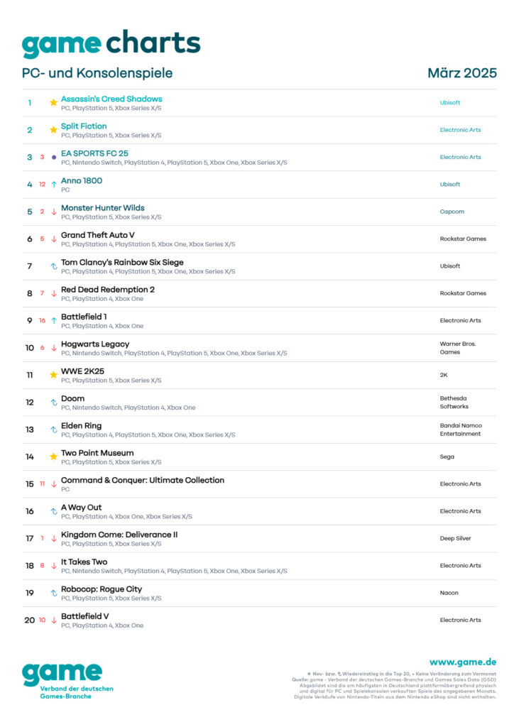 Zwei neu erschienene Games erobern im März die offiziellen game Charts: Kurz nach seiner Veröffentlichung belegt das Action-Adventure „Assassin’s Creed Shadows“ (Ubisoft) gleich den Spitzenplatz der meistverkauften PC- und Konsolenspiele in Deutschland. Im neuesten Titel der bekannten Spielereihe begeben sich Spielende als eine Shinobi-Assassinin oder ein Samurai auf ein episches Abenteuer im Japan des 16. Jahrhunderts. Das kooperative Multiplayer-Spiel „Split Fiction“ (Electronic Arts) feiert ebenfalls einen Charts-Erfolg und landet auf dem zweiten Platz. Im Koop-Abenteuer tauchen Spielerinnen und Spieler gemeinsam in die fantasievollen Welten ein, die direkt der Gedankenwelt der beiden Hauptfiguren entspringen, und stellen sich gemeinsam actionreichen Herausforderungen. Die Top 3 der erfolgreichsten Spiele im März rundet die Fußball-Simulation „EA SPORTS FC 25“ (Electronic Arts) ab. Außerdem neu in den Charts: das Wrestling-Spiel „WWE 2K25“ (2K) auf dem elften Platz sowie die Museum-Simulation „Two Point Museum“ (SEGA) auf Platz 14.