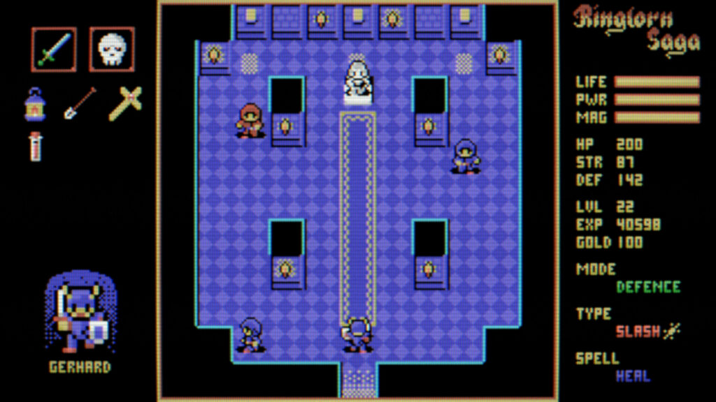 Der Spieler wird nach einem kurzen Prolog in die Haut des Protagonisten Gerhard gesteckt und muss die Geheimnisse um das Verschwinden seines Vaters ergründen. Viel mehr Erklärungen gibt es nicht, man findet sich in bester Zelda-Manier in der Welt und beginnt sein Abenteuer. Das NES-Zelda dient dabei in vielerlei Hinsicht als Inspirationsquelle für Ringlorn Saga. Sei es das Inventar und die Items (Lampe, Schwert, Schaufel), sei es die Welt, die in kleinen Quadraten aufgeteilt ist, sei es die simple Optik und der Schwierigkeitsgrad. Das Gameplay funktioniert dabei simpel. Mit A wechselt der Spieler zwischen dem Attack- und dem Defencemode hin und her. Ein Druck auf B gibt dem Spieler verschiedene Attacken zur Wahl, die in verschiedenen Werten (Stärke, Verteidigung usw.) differieren.