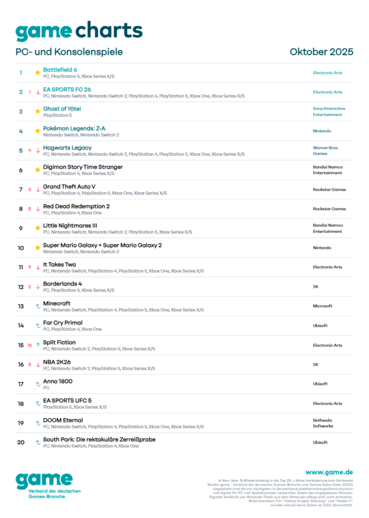 Im Oktober landen gleich sechs neu erschienene Spiele in den offiziellen game Charts. Die Spitze der Charts führt „Battlefield 6“ (Electronic Arts) an. Der sechste Teil der bekannten First-Person-Shooter-Reihe erschien im Oktober und setzte sich als meistverkauftes Spiel für PC und Konsole des Monats in Deutschland durch. Fünf weitere Neuerscheinungen schaffen es direkt in die Top 10: Das Action-Adventure im Japan des 17. Jahrhunderts „Ghost of Yōtei“ (Sony Interactive Entertainment) sichert sich in seinem Veröffentlichungsmonat den dritten Platz in den Charts, gefolgt vom Abenteuerspiel voller Pokémon-Kämpfe „Pokémon-Legenden: Z-A“ (Nintendo) auf Platz 4. Auf dem sechsten Platz landet das Rollenspiel „Digimon Story Time Stranger“ (Bandai Namco Entertainment) rund um die digitalen Monster Digimon und zahlreiche Abenteuer, die sich im Spiel zwischen der menschlichen und digitalen Welt erstrecken. Der dritte Teil der gleichnamigen Horror-Abenteuer-Reihe „Little Nightmares III“ (Bandai Namco Entertainment), in dem die neuen Protagonisten Low und Alone in einer Welt aus gefährlichen Illusionen überleben müssen, steigt auf Platz neun ein. Die Top 10 rundet das Bundle „Super Mario Galaxy + Super Mario Galaxy 2“ (Nintendo) ab, mit dem Spielende sich als Mario, Luigi oder Yoshi auf Weltraumexpeditionen begeben und dabei spannungsvollen Herausforderungen stellen.