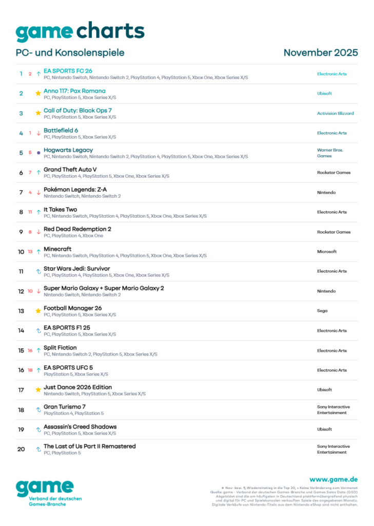 Gleich zwei neu erschienene Games schaffen im November den Einstieg in die Top 3 der offiziellen game Charts: Die Aufbaustrategie aus deutscher Produktion „Anno 117: Pax Romana“ (Ubisoft) erobert in ihrem Veröffentlichungsmonat den zweiten Platz der meistverkauften PC- und Konsolenspiele in Deutschland. Im neuesten Teil der bekannten Reihe übernehmen Spielende als Statthalterin bzw. Statthalter den Aufbau von je einer Region im Römischen Reich und dem Keltischen Königreich im 2. Jahrhundert. Auf dem dritten Platz folgt der First-Person-Shooter „Call of Duty: Black Ops 7“ (Activision Blizzard). In der Fortsetzung der beliebten Action-Reihe begibt man sich im Rahmen der Kampagne als Kommandant eines Eliteteams auf eine actiongeladene geheime Mission, um die Welt vor einem unumkehrbaren globalen Konflikt zu retten. Neu in den November-Charts sind außerdem die Fußballsimulation „Football Manager 26“ (Sega), die auf Platz 13 einsteigt, sowie das Tanzspiel „Just Dance 2026 Edition“ (Ubisoft) auf Platz 17.