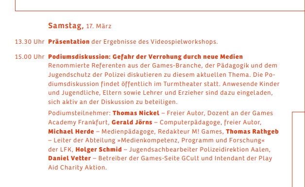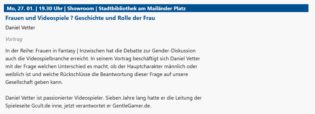 Seit dem Jahr 2012 halte ich regelmäßig Vorträge über die Verbindung von Kultur und Videospielen. Dabei geht es um die Frage, wie digitale Spiele Geschichten erzählen, welche gesellschaftlichen Themen sie aufgreifen und welche Bedeutung sie in der heutigen Kultur einnehmen. Über viele Jahre war ich eng mit der Stadtbibliothek Stuttgart und der Stadtbibliothek Düsseldorf verbunden, wo ich Projekte entwickelte, die den kulturellen und bildenden Wert von Games sichtbar machen. Einige meiner Vorträge können unten angesehen werden.
